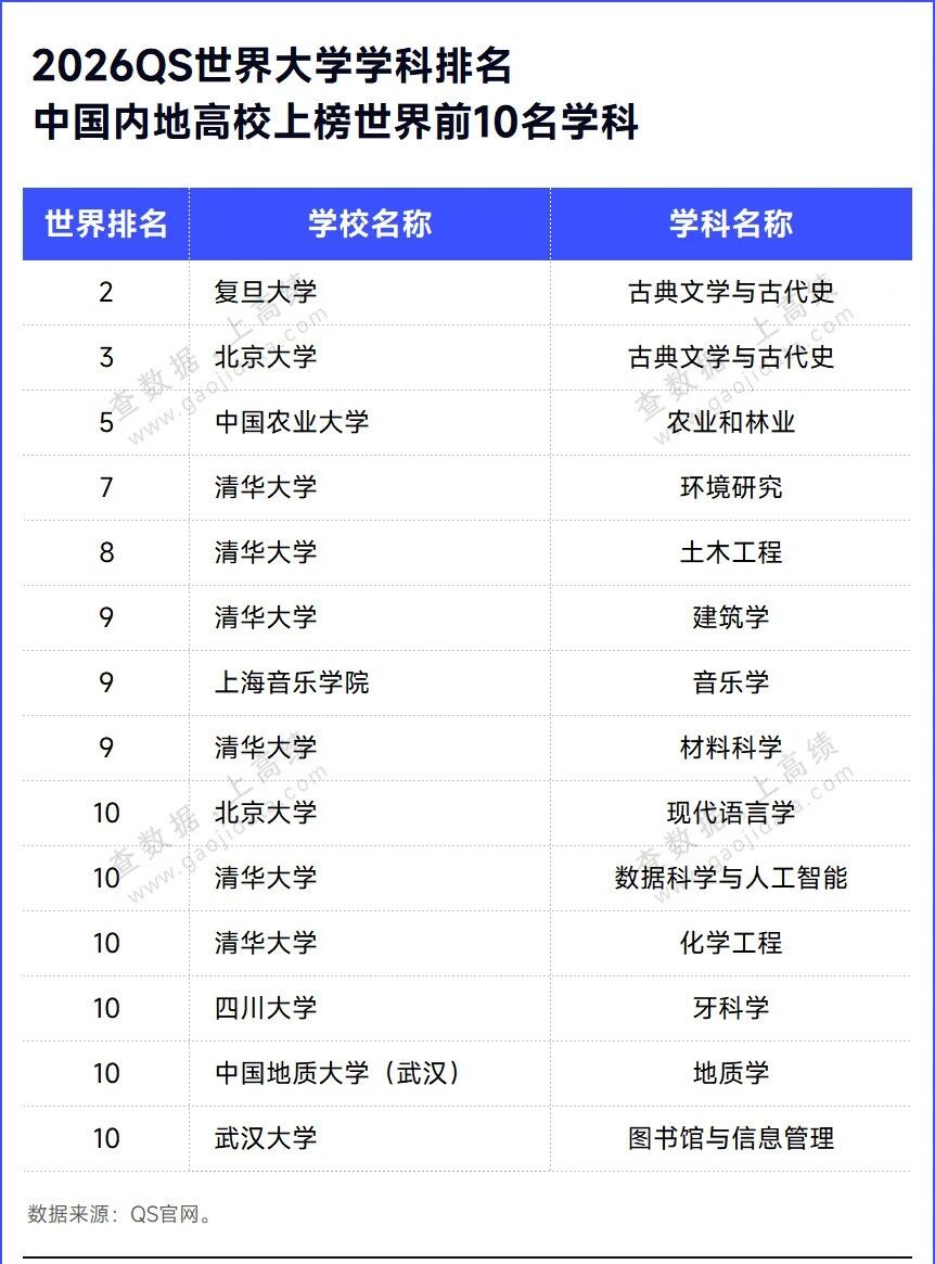 本次排名中,中国高校共有14个学科位列全球前10。排名最高的是复旦大学的古典文学与古代史学科,位列全球第2名。清华大学拥有6个全球前10学科,数量上领跑内地高校。