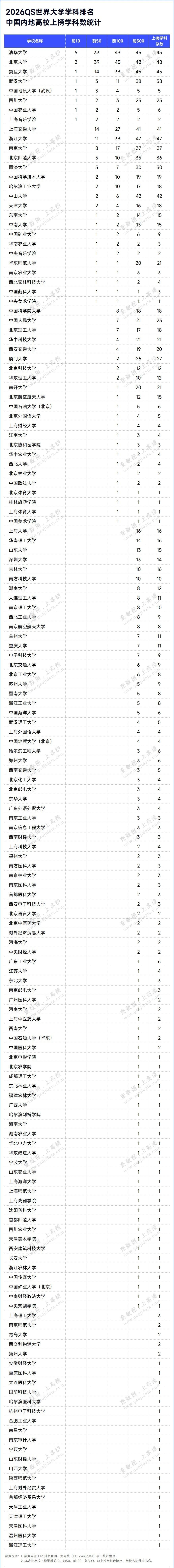 中国内地高校上榜学科数统计如下: