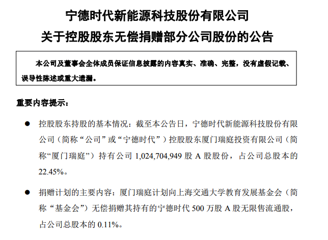 3月31日,宁德时代晚间公告称,2026年3月31日,宁德时代新能源科技股份有限公司接到控股股东厦门瑞庭投资有限公司通知,其与上海交通大学教育发展基金会签订了《上海交通大学“曾毓群教育基金”捐赠协议书》,厦门瑞庭拟向基金会无偿捐赠其持有的宁德时代500万股A股无限售流通股。前述捐赠股份产生的全部收益及所得资金将全部注入“曾毓群教育发展基金”,用于支持上海交通大学教育事业发展。