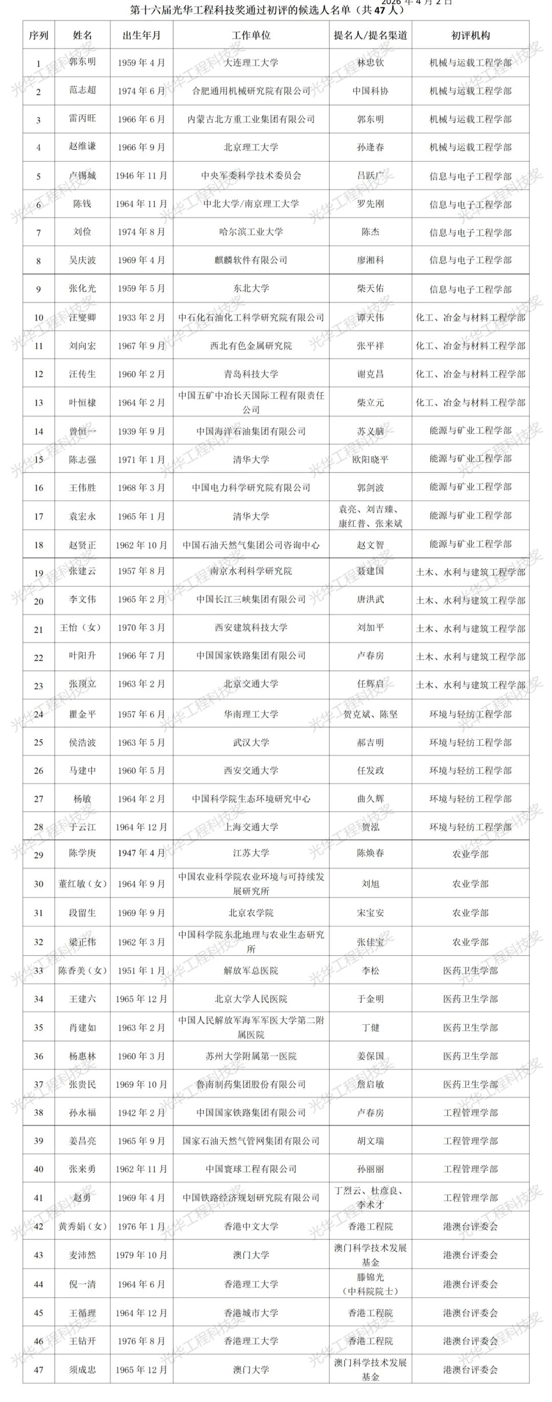 4月2日,中国工程院发布《关于公布第十六届光华工程科技奖通过初评的候选人名单的公告》。
