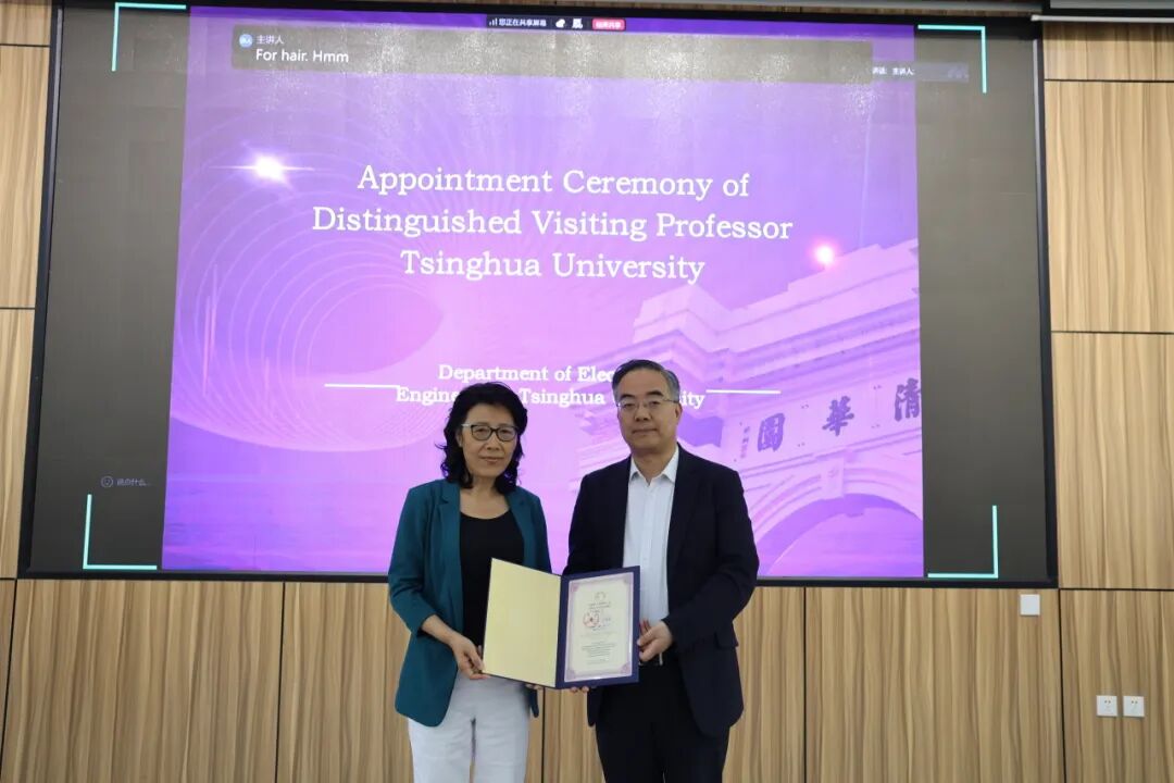 在聘任仪式上,清华大学电机系副主任孙凯介绍了卞建华院士的学术成就以及在推动电力能源领域国际交流合作方面的重要贡献。清华大学电机系主任、IEEE PCCC主席康重庆向卞建华院士颁发清华大学杰出访问教授聘书,并对她长期以来给予清华大学电机系发展的支持与帮助表示感谢,期待双方未来在人才培养、科研创新及国际学术交流等方面开展更加深入、全面的合作。