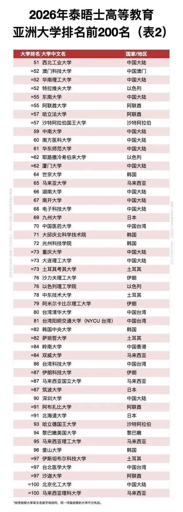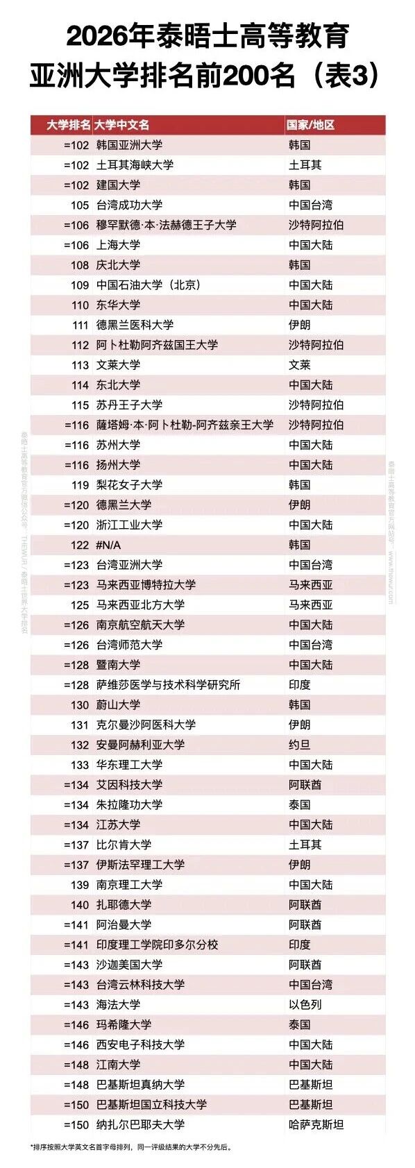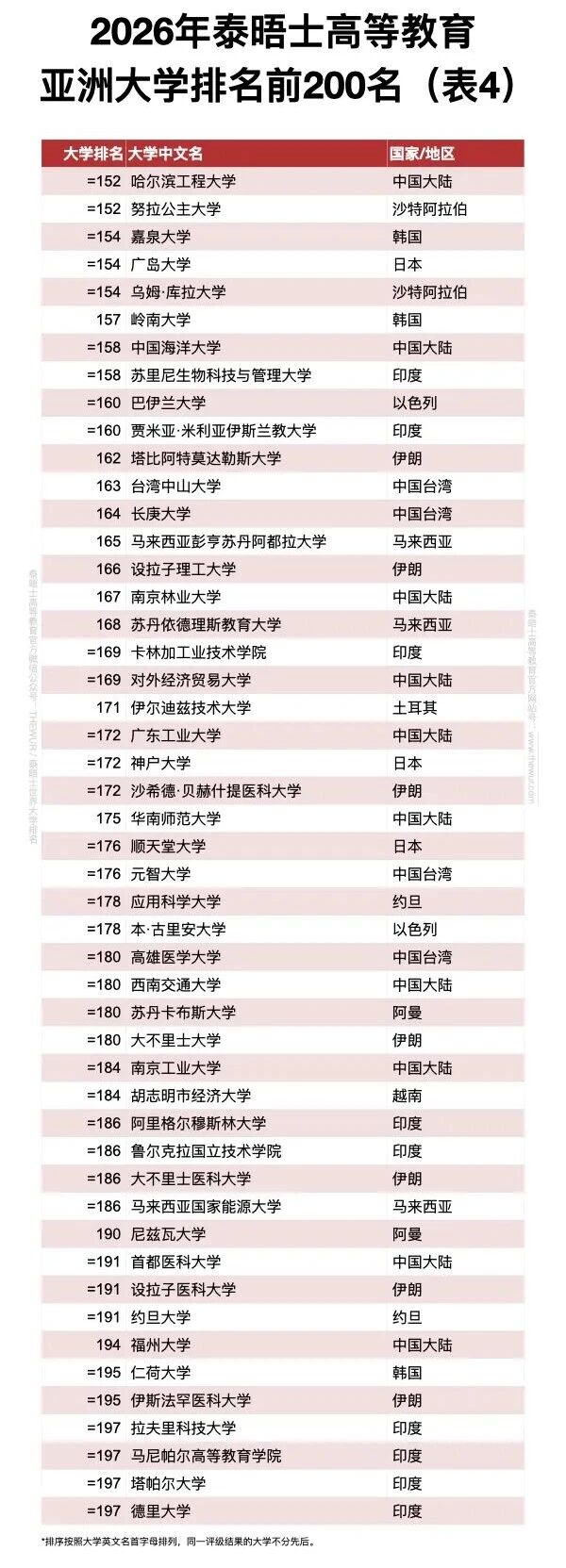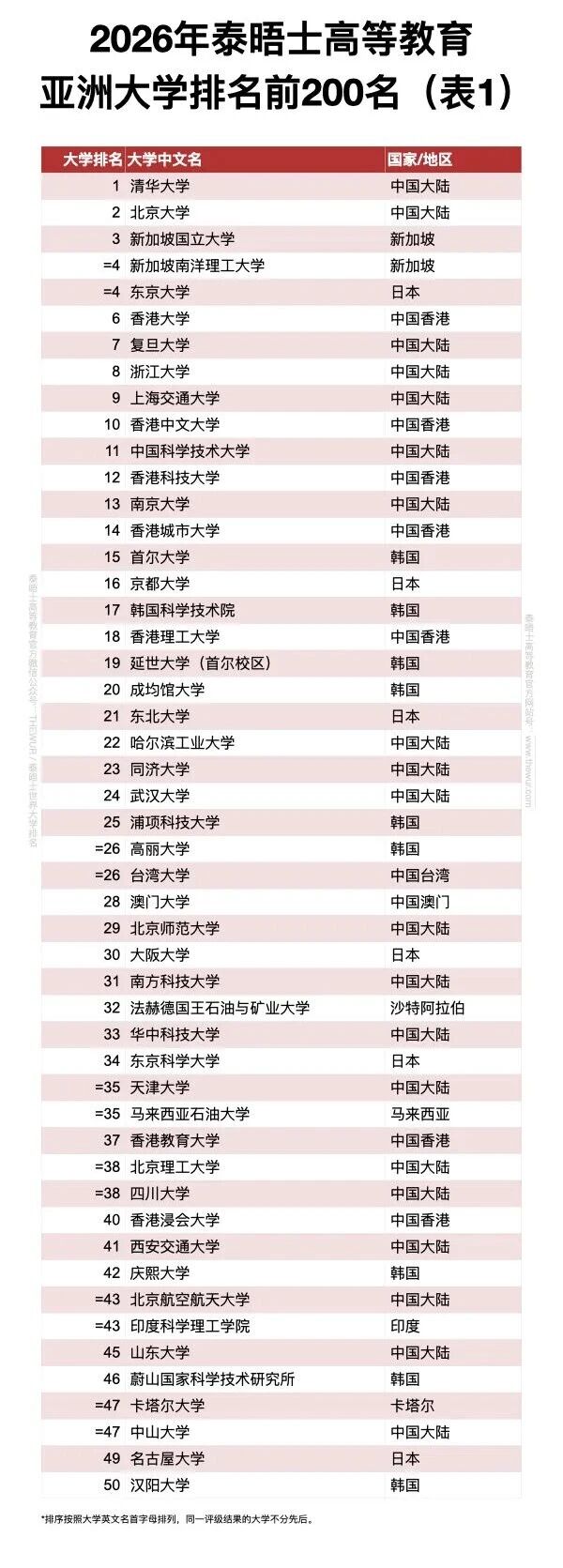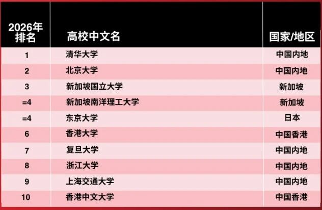 4月24日,英国泰晤士高等教育最新公布的2026年亚洲大学排名显示,清华、北大分列第一、二位。香港8所高校全部跻身前一百名,港大第六、港中大第十、港科大第十二、港城大第十四、港理大第十八、香港浸会大学第四十。香港教育大学(第三十七)、香港岭南大学(第八十四)首次上榜即入百强。